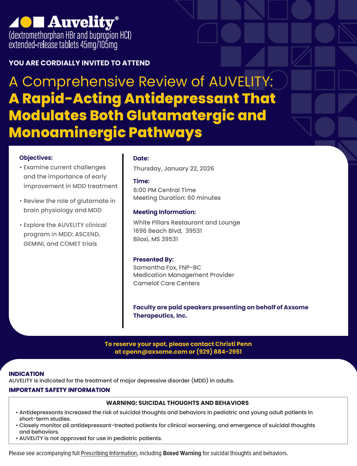 AUVELITY is indicated for the treatment of major depressive disorder (MDD) in adults and does not have an indication for use in individuals under 18 years of age. Pursuant to the PhRMA Code on Interactions with Healthcare Professionals and Axsome Therapeutics company guidelines for this product, Pediatric Nurse Practitioners are excluded from participation in this event or from receiving a complimentary meal in association with this event. Please accept our apologies. This exclusion is specific to this sponsor's event/product and is not applicable to other MANP events unless noted. You do not have to be a member of MANP to attend.